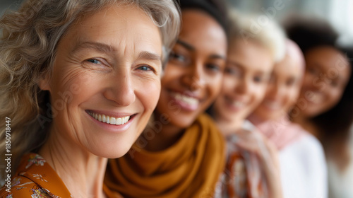 Portrait of multi-generational and multi-ethnic group of faceless women smiling together in display of unity and community, defocused diverse female solidarity, with copy space