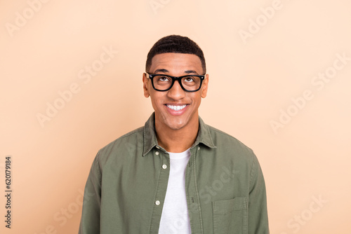 Portrait of nice cheerful guy beaming smile look interested up above empty space isolated on beige color background