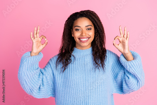 Portrait of nice young girl demonstrate okey symbol wear sweater isolated on pink color background