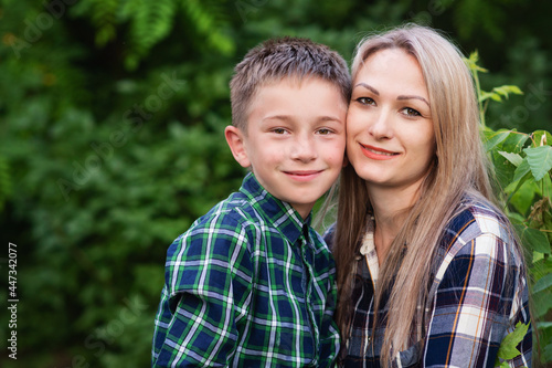 Portrait of nice young mother with pleasure spending time with precious son in Backyard. Vacation. Hugging lovely mom, having fun together, happy family enjoying life