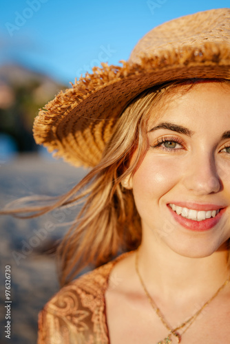 portrait, woman, summer, beach, freedom, sunset, people, attractive, beautiful, beauty, blond, calm, caucasian, looking, enjoy, enjoying, enjoyment, female, free, girl, happiness, happy, health, healthy, holiday, journey, leisure, lifestyle, ocean, 1, hair, person, smile, hat, emotion, sand, sea, sun, cheerful, travel, positive, vacation, vacation, vitality, camera, young