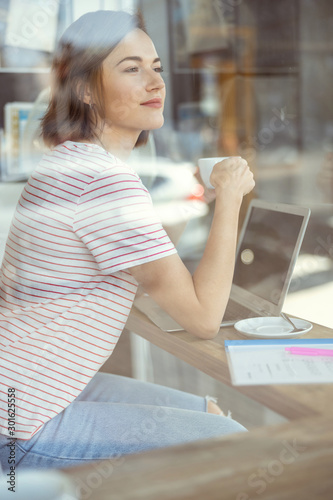 Portrait of pleased girl that enjoying coffee