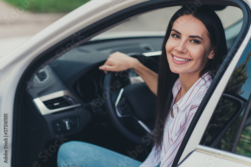 Portrait of positive cheerful girl driving license teacher study ride drive car invite students sit seat cabin automobile in city center