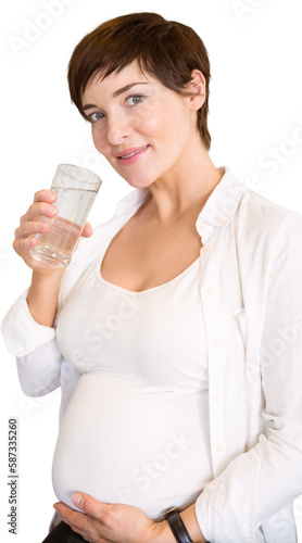 one person, mature adult, woman, female, caucasian, pregnancy, expecting, pregnant, belly, maternity, active, health, healthy, lifestyle, mother, standing, white background, isolated, studio shot, cut-out, short hair, wellness, bodycare, expectant, holding, portrait, happiness, brunette, brown hair, water, glasses, refreshment, drinking