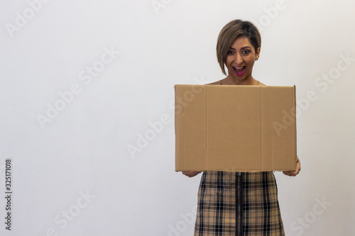 Portrait of pretty latin young woman model notices something unexpected, keeps mouth widely opened, being surprised with cardboard box, isolated on white background studio shot, plaid dress, dark air.