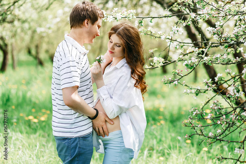 Portrait of pretty lovely future parents during sunset on nature apple tree background