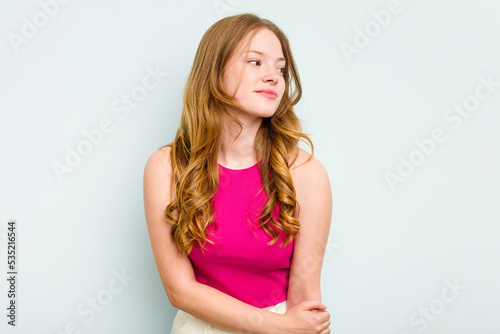 Portrait of pretty young caucasian woman isolated on blue background