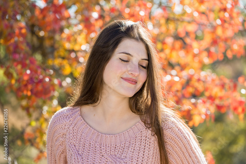 Portrait of pretty young woman in stylish knitted sweater standing on the golden autumn forest on sunny day