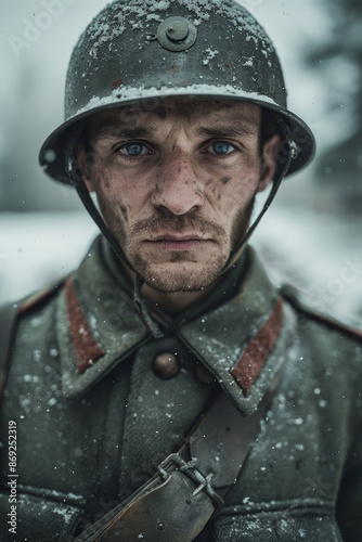 russian, soldier, portrait, uniform, grave, expression, insignia, snow-covered, ground, war, military, history, historical, combat, army, serious, face, wartime, helmet, winter, battlefield, armed forces, vintage, classic