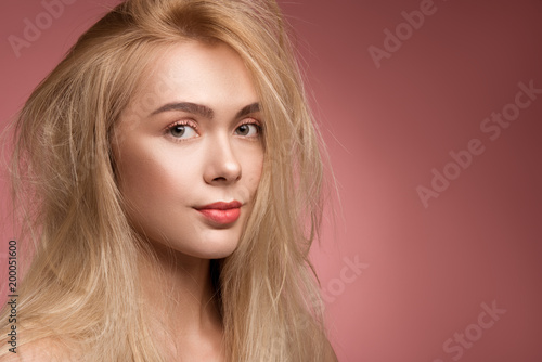 Portrait of sad lady with disheveled hair looking at camera. Copy space in right side. Isolated on rose background