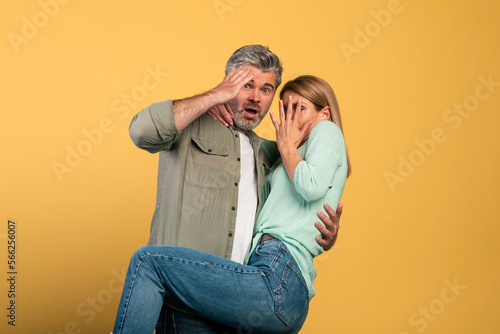 Portrait of scared middle aged couple covering mouth and eyes, woman jumping on man, looking at camera