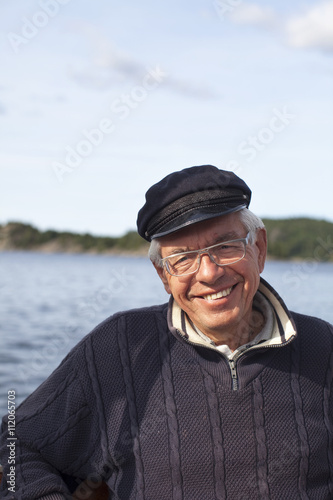 people, real people, outdoors, vertical, front view, cap, goggles, leisure, smiling, sweater, casual clothes, copy space, portrait, man, adult, waist up, 1, colours, day, grey-haired, toothy smile, sweden, scandinavia, short hair, water