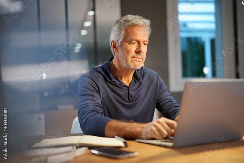 senior, man, mature, laptop, telework, connected, grey hair, photogenic, 50s, 50s, european, casual attire, smiling, evening, businessman, entrepreneur, active, indoor, one person, office