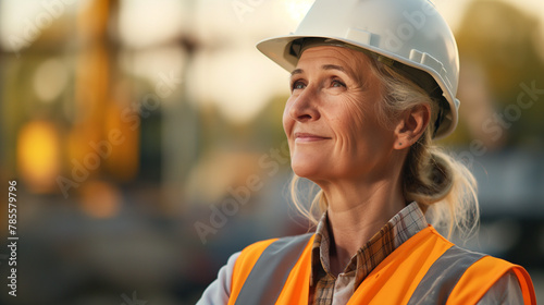 Portrait of senior woman in a protective helmet, production worker or inspector, builder.