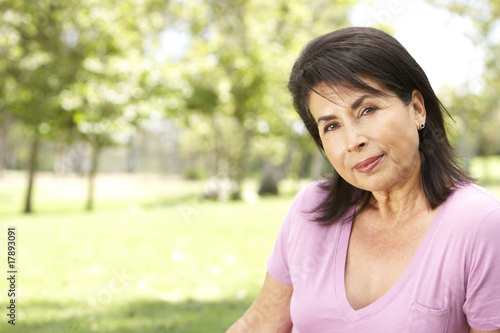 woman, senior, garden, park, countryside, sitting, relaxed, relaxing, lifestyle, female, outdoors, person, portrait, smiling, happy, one person, horizontal, laughing, copy space, 50s, 50s, hispanic, pretty, beautiful, attractive, at camera