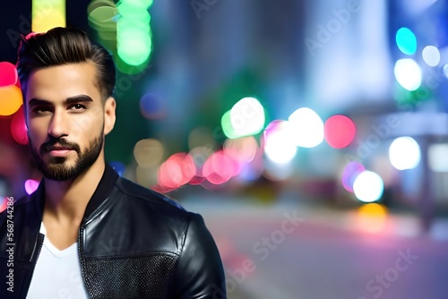 Portrait of sexy bearded model man in black leather jacket in night city. Bokeh background.. Generative ai.
