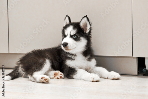 Portrait of siberian Husky puppy with blue eyes indoor at home. Cute pet.