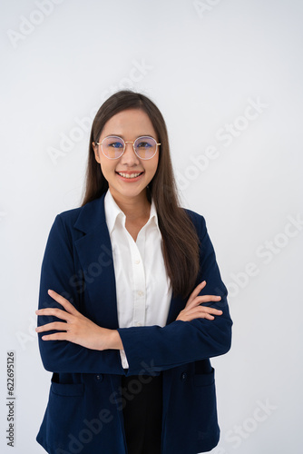 Portrait of smart and happy young thoughtful Asian business women think for new ideas on isolated white background. Concept of advertising marketing and product placement.