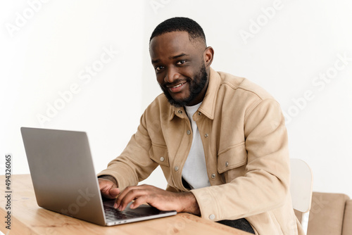 Portrait of smiling african american man looking at camera while sitting at table in home office and working on laptop. Happy black freelancer posing at workplace at home.