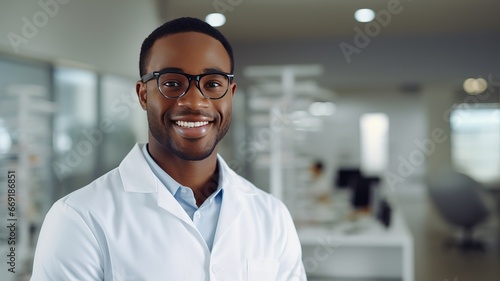 Portrait of smiling attractive african american young male doctor wearing in a white coat standing in a hospital background looking at camera. Good family doctor, therapist advice and friendly. ai.