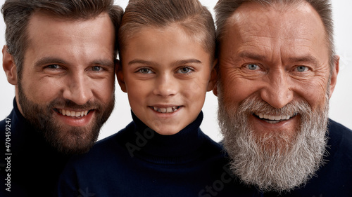 generation, man, three, portrait, face, smile, together, offspring, closeup, family, son, father, grandfather, young, old, descendant, oneness, bonding, happy, fatherhood, male, laugh, laughter, grandparent, boy, children, children, upbringing, lifestyle, caucasian, elderly, adult, people, person, love, care, parenthood, eltern, togetherness, grandson, father, camera, look, white, studio, background, crop, wide, web, banner