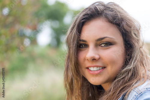 Portrait of smiling long hair brunette teenage girl outdoors closeup.