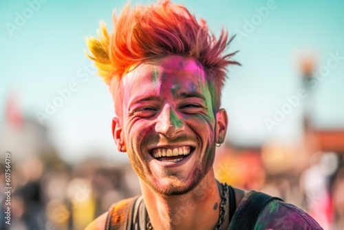 Portrait of smiling man during color festival. AI generative art