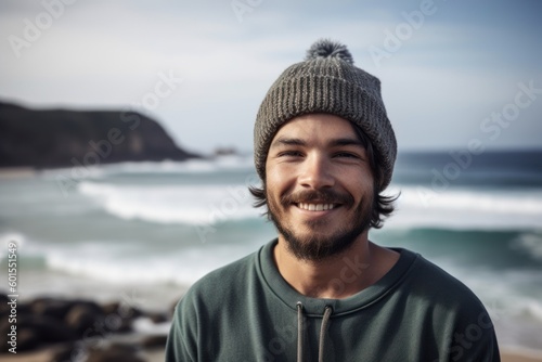 portrait, photo, group, expression, satisfied, emotion, man, 20s, young, male, wool, comfy, protection, knit up, soft, clothing, cosy, apparel, hat, warmth, cute, beanie, style, fashion, stylish, coastline, tropical, wave, relaxation, background, travel, vacation, sand, sea, ocean
