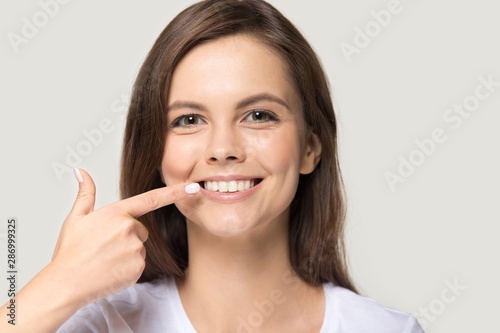 advertising, background, care, caucasian, clean, client, clinic, closeup, concept, client, demonstrate, dental, dentistry, excited, face, female, girl, good, grey, happy, healthy, hygiene, isolated, joyful, lady, laugh, medicals, model, mouth, oral, orthodontic, patient, people, honed, person, point, positive, result, satisfied, show, smile, dentistry, studio, teeth, treatment, wellness, white, whiten, woman, young