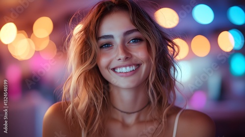 Portrait of smiling redheaded young woman illuminated by colorful bokeh lights in evening setting creating vibrant festive atmosphere and warm glowing complexion