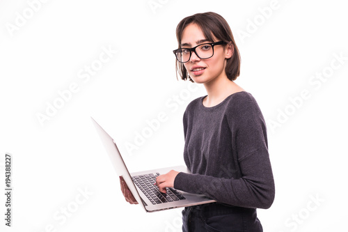 Portrait of smiling teen girl holding laptop computer isolated on a white background