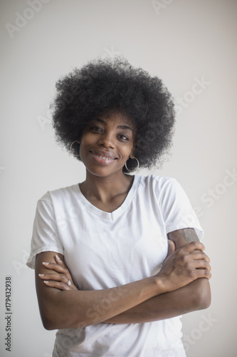woman, mid, adult, african, racked, smile, portrait, lifestyle, casual attire, black hair, afro, waist up, front, alone, 1, isolated, white, indoor, people