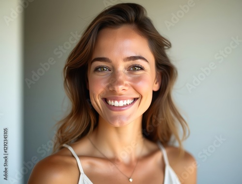 Portrait of smiling woman with long brown hair showing perfect teeth