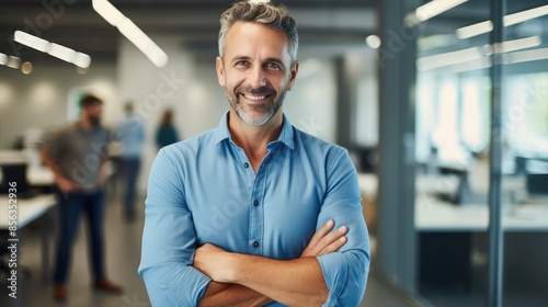 Portrait of smiling young businessman standing with arms crossed in modern office