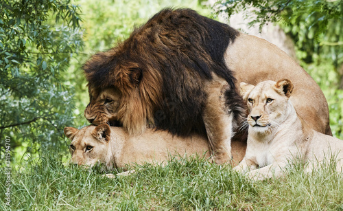 Portrait of South African lion (Panthera leo krugeri) relaxing in a meadow at ZOO