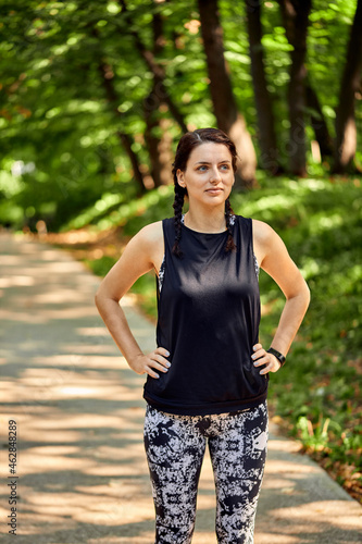 sporty, young, woman, forest, 1, copy space, people, sport, adult, female, caucasian, healthy, lifestyle, fitness, training, runner, physical exercise, exercising, summer, fit, well-being, outdoors, park, shadow, vitality, hobby, athlete, leisure, recreational, exercise, tree, exercise, sportive, nature, jogger, recreation, health, path, standing, braid, pensive, thinking, contemplation, hand, hip, track, season, jogging