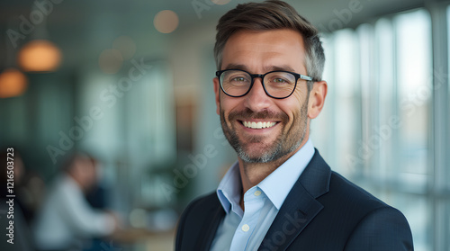 portrait of successful businessman consultant looking at camera and smiling inside modern office building
