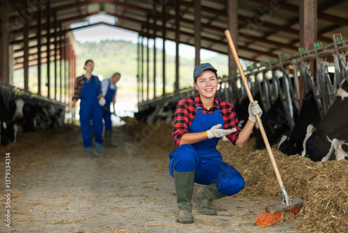 Portrait of successful young girl farmer standing in open cowshed at dairy cow farm