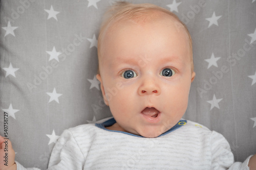 Portrait of surprised newborn baby with open mouth, close-up. Cut child with blue eyes, looking at camera. Face expression.