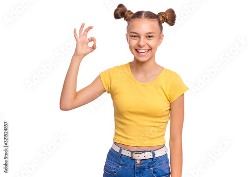 Portrait of teen girl making Ok Gesture, isolated on white background. Beautiful caucasian young teenager smiling and giving OK sign. Happy cute child showing okay.