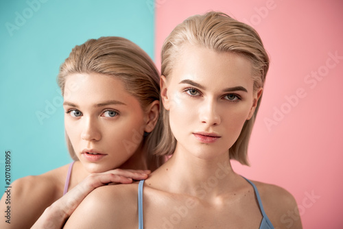 Portrait of tender women standing in hug one behind another. They staring at camera. Isolated on blue and pink background
