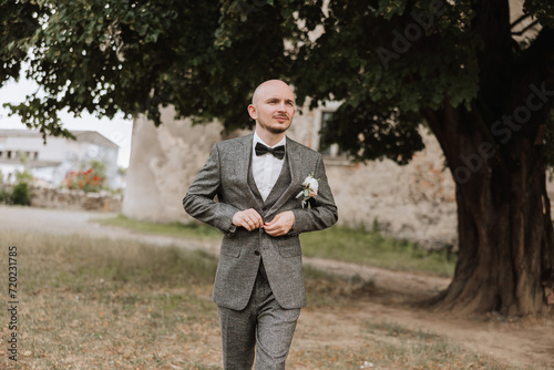 Portrait of the groom in nature in the summer. A stylish groom in an elegant gray business suit walks forward. Businessman in nature. Portrait of a successful man. Wedding portrait of the groom.