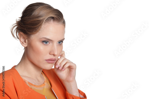 admirable, background, beautiful, bonnie, caucasian, cute, distaff, fashion, female, fine, girl, hair, human, isolated, jacket, life, mistress, model, 1, orange, pensive, personable, portrait, posing, pretty, sensual, serious, single, stress, studio, style, tender, thinks, thoughtful, white, woman, womanly, young, young adult, youth