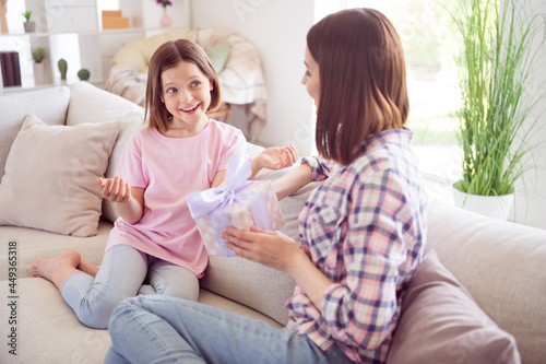 Portrait of two attractive cheerful careful girls sitting on divan giving giftbox at home flat indoors