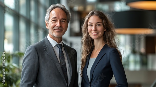portrait, business, professional, man, woman, suit, corporate, office, colleague, teamwork, partnership, success, leadership, confident, smiling, indoor, background, modern, building, attire, people