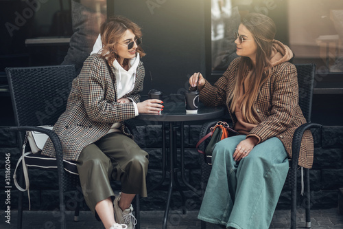 fashion, portrait, stylish, 2, beautiful, beauty, casual attire, girl, hair, happy, lady, lifestyle, people, style, urban, vogue, woman, cold, couple, friendly, friendship, gorgeous, coiffure, party, shopping, sister, smooth, together, young, attractive, business, girl, woman, female, brunette, autumn, spring, fall, photogenic, sunglasses, cousin, jacket, hot drink, drink, tea, break, lunch, conversation, dialogue, communication