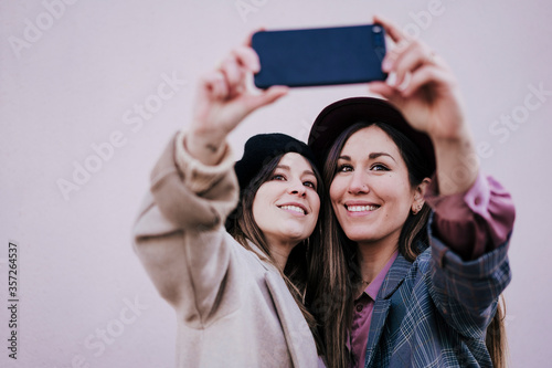 portrait, 2, happy, woman, taking, selfie, smartphone, copy space, people, adult, photographing, smiling, joy, happiness, leisure, harmony, lifestyle, bonding, attractive, outdoors, day, looking, human relationships, beauty, familiarity, togetherness, coloured, self-portrait, beautiful, best, mid, pair, caucasian, brown, hair, long, spain, friendship, plain, female, young