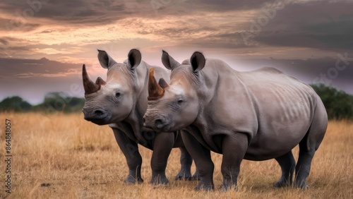 portrait of two white rhinoceroses (Ceratotherium simum) in South Africa, highlighting their massive size and textured skin
