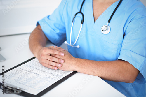 Portrait of unknown male surgeon doctor sitting at the table in hospital office, stethoscope