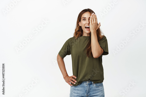 Portrait of woman look surprised with one eye, cover half face with hand and smiling excited, before after cosmetic effect, makeup advertisement, white background
